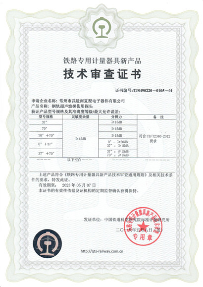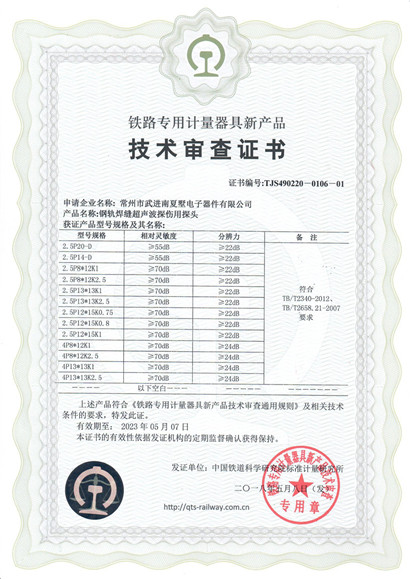 2018年,中国铁道科学研究院标准计量研究所对公司生产的钢轨超声波探伤用探头和钢轨焊缝超声波探伤用探头进行了技术审查,并在5月颁发了技术审查证书。我公司成为首批通过中国铁道科学研究院标准计量研究所技术审查的超声波换能器专业生产企业。